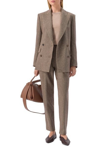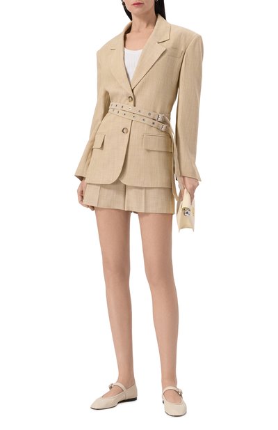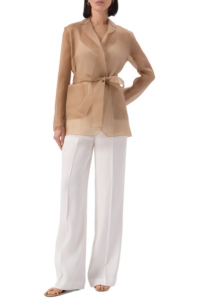 Для пошива жакета с четырьмя накладными карманами использовали вискозу с добавлением льна. Модель дополнили регулируемым поясом с прошитыми люверсами и контрастной пряжкой.