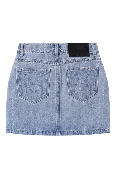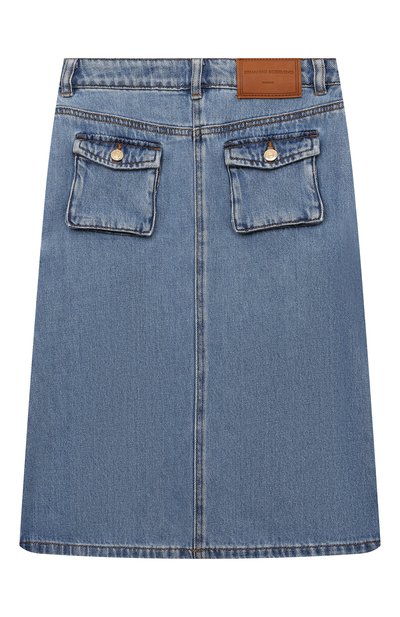 Джинсовую юбку с пятью карманами украсили патчем с вышитой эмблемой на поясе сзади. Модель с брендированной пуговицей выполнили из денима средней плотности.
