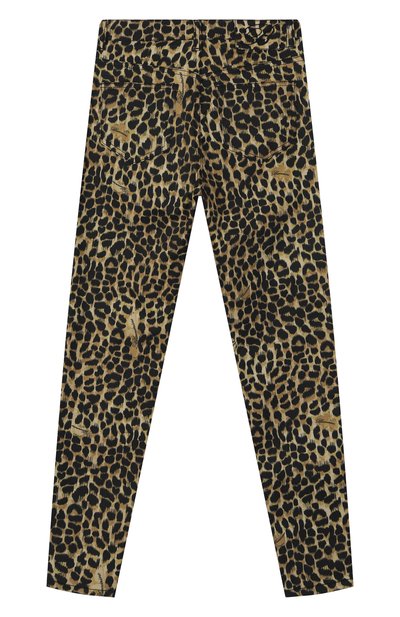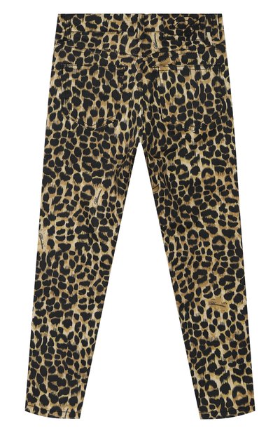Для пошива брюк с пятью карманами использовали стрейчевую хлопковую ткань с леопардовым принтом. На поясе сзади – патч с таким же анималистичным мотивом, украшенный эмблемой бренда.
