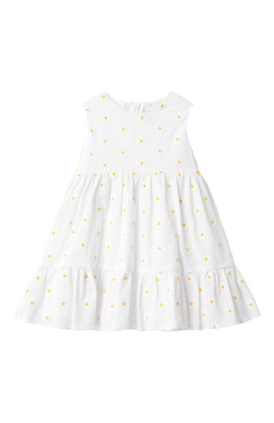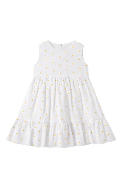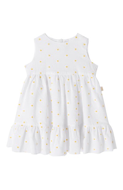 Платье с широким воланом на подоле сшили из хлопка с геометрическим брендированным паттерном. Модель застегивается потайной молнией сзади.