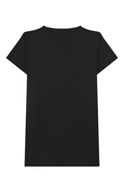 Платье, напоминающее удлиненную футболку, сшили из хлопка. Под круглой горловиной, укрепленной трикотажным кантом, напечатали контрастный логотип.