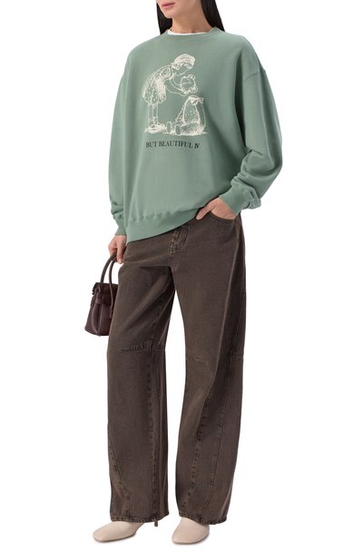Свитшот с манжетами, поясом и горловиной в рубчик сшили из органического хлопка, сертифицированного по стандарту GOTS. Модель украсили надписью APC Rue Madame Paris, вышитой контрастными нитями.