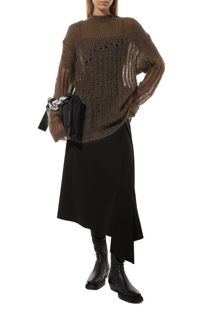 Свитер со спущенной линией плеч связали ажурной резинкой из хлопковой пр яжи. Модель с V-образной горловиной, манжетами и поясом в рубчик украсили цепочкой мониль сзади.