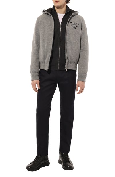Бомбер с рифлеными поясом, манжетами и подкладом на воротнике-стойке застегивается встречной молнией. Куртку из кашемира дополнили внутренним и боковыми карманами.