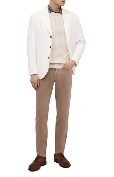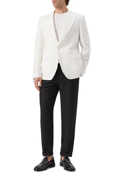 Однобортный пиджак с заостренными лацканами и шлицей сзади изготовили из льняной ткани. Модель дополнили внутренним и тремя внешними карманами, украсив нагрудный патчем с геральдической эмблемой, вышитой канителью, люрексом и бисером.