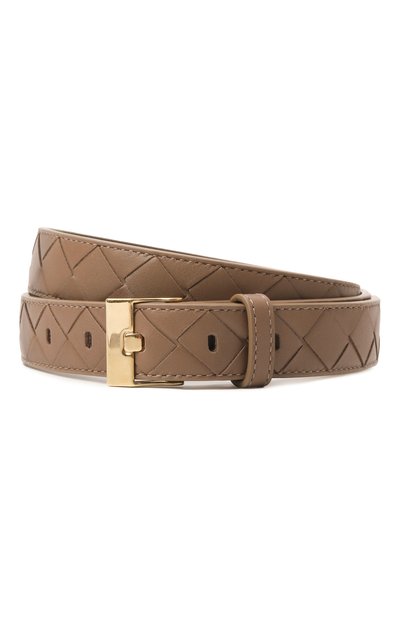 Ремень с цельной изнанкой выполнили в фирменной технике плетения intrecciato из телячьей кожи. Модель с одной шлевкой застегивается небольшой пряжкой с широким язычком.