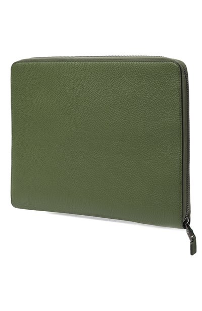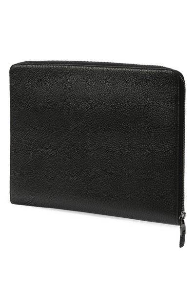 Футляр с тремя карточными слотами внутри сшит из зернистой кожи. Аксессуар, украшенный фирменной фурнитурой, застегивается молнией с ручкой-петлей.