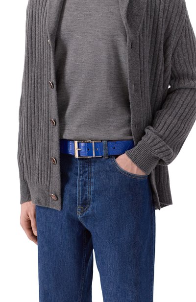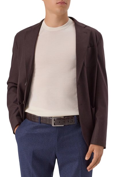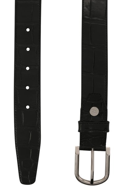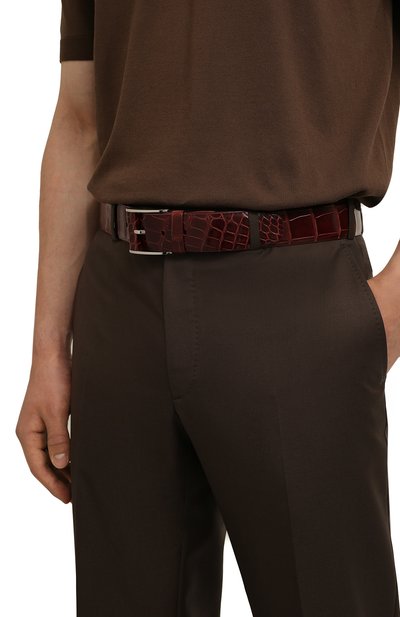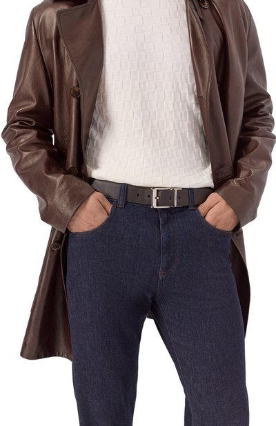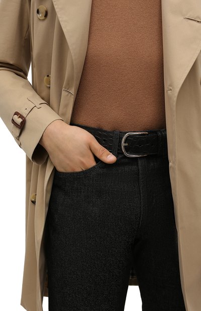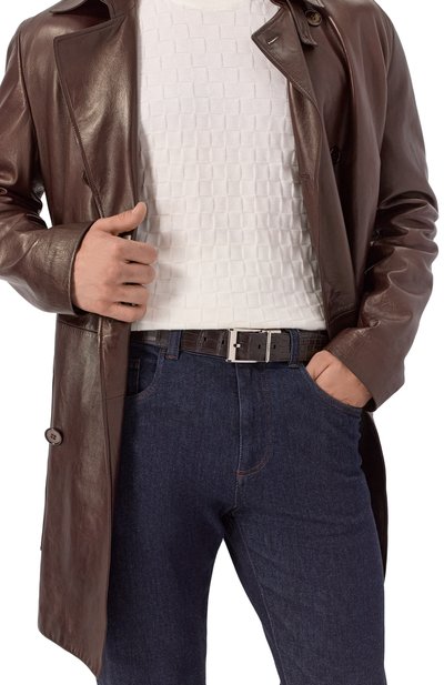 Ремень из фактурной кожи каймана укрепили изнутри гладкой телячьей. Прямоугольную пряжку из латуни украсили выгравированным логотипом на торце и тренчике.