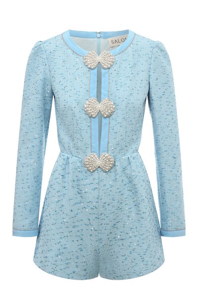 Для пошива комбинезона Baviera с широкими атласными лацканами и стрелками использовали триацетат с добавлением полиэстера. Модель с запахом и поясом дополнена нагрудным карманом, парой боковых и двумя задними.