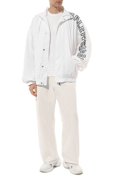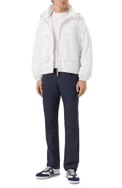 Одну сторону куртки с воротником-стойкой изготовили из джерси на основе шелка и хлопка, а вторую – из полиамида стрейч. Модель на встречной молнии дополнили эластичными манжетами и поясом. На обеих сторонах предусмотрели боковые карманы и фирменную эмблему Solomeo.