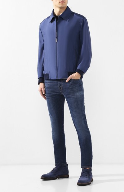 Бомбер с манжетами и поясом на резинке сшили из перфорированной замши. Куртку на встречной молнии дополнили подкладом из шелкового атласа с вышитой монограммой и кожаным брендированным патчем рядом с потайным карманом. Под трикотажным воротником разместили брендированную пластину, а рядом с левым боко вым карманом – фирменный октагон.