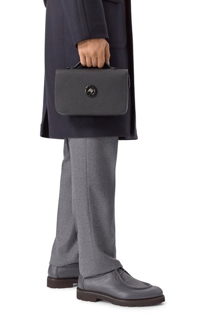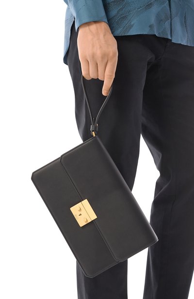 Борсетку с короткой ручкой и металлическим логотипом спереди сшили из зернистой кожи. Аксессуар с двумя отделениями, застегивающимися молниями, дополнили внутренним карманом с клапаном и карточными слотами.