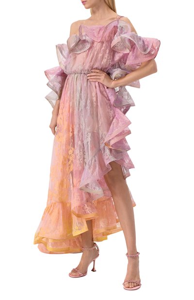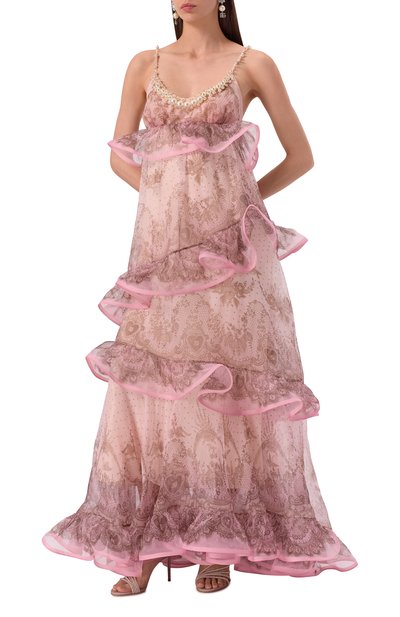 Платье с расклешенным подолом сшили из шелка хаботай в неровную диагональную полоску. Ткань раскроили так, чтобы сформировать имитацию фирменного плетения intrecciato на талии. Широкие бретели завязали узлами на плечах.