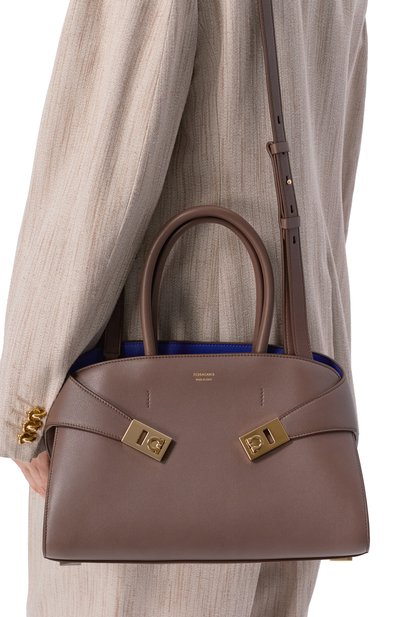 Сумка Hug с двумя короткими ручками и съемным плечевым ремнем сшита из зернистой телячьей кожи. Аксессуар с внутренним карманом на молнии дополнен фирменным брелоком и фигурными ремешками с пряжками Gancini.