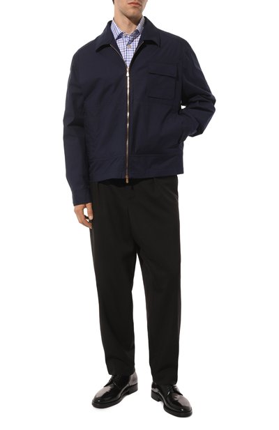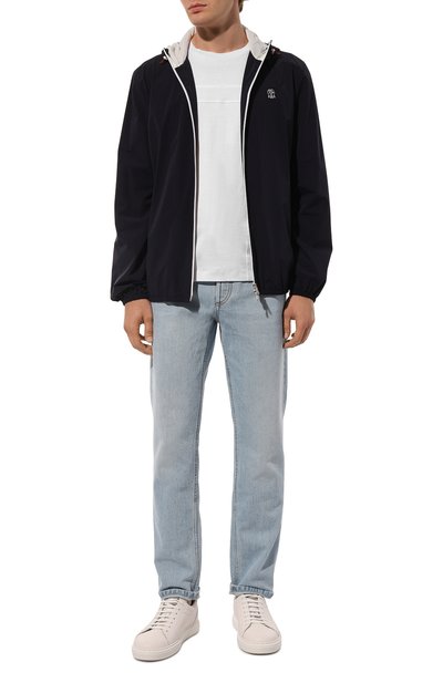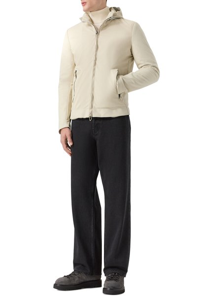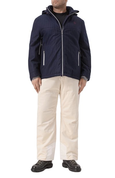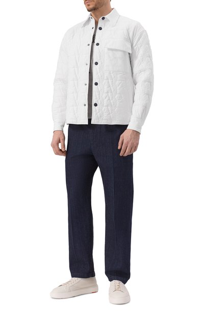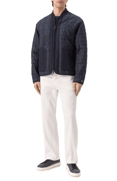 Стеганую куртку с ребристым воротником-стойкой и вышитым на груди логотипом сшили из хлопка. Встречную молнию с брендированными пуллерами скрыли под узкими планками. По бокам предусмотрели накладные карманы, а внутри — прорезной.