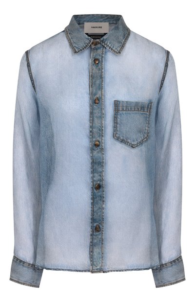Для пошива рубашки Ronda с отложным вор отником использовали полупрозрачный шелк, окрашенный под деним. Модель с накладным карманом застегивается роговыми пуговицами.