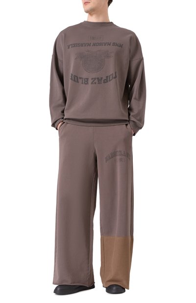 Выбеленный свитшот со спущенной линией плеч сшили из хлопкового трикотажа. Модель с потертостями на рифленых манжетах, горловине и поясе украсили флокированной эмблемой.