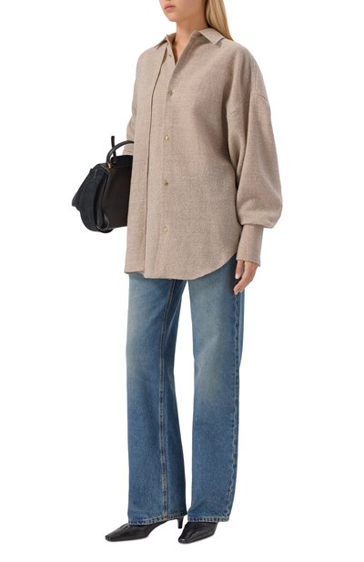 Свободную рубашку в пижамном стиле сшили из гладкой вискозы с паттерном из логотипа бренда. Модель со спущенной линией плеч дополнили нагрудным накладным карманом.