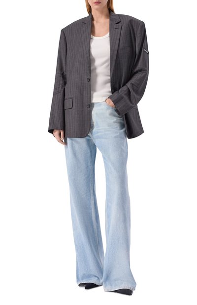 Жакет силуэта oversize сшили из микса шерсти и шелка. Модель с акцентированной линией плеча, широкими лацканами, внутренним и двумя внешними карманами оставили без застежки.