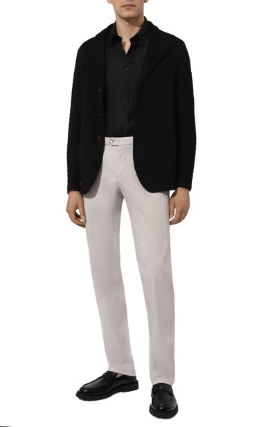 Брюки с боковыми и задними карманами выполнили из хлопкового вельвета с добавлением шелка и эластана. На широком поясе зауженной модели предусмотрели потайную кулиску со шнуром. В комплекте — фирменный брелок с маской Пульчинеллы.