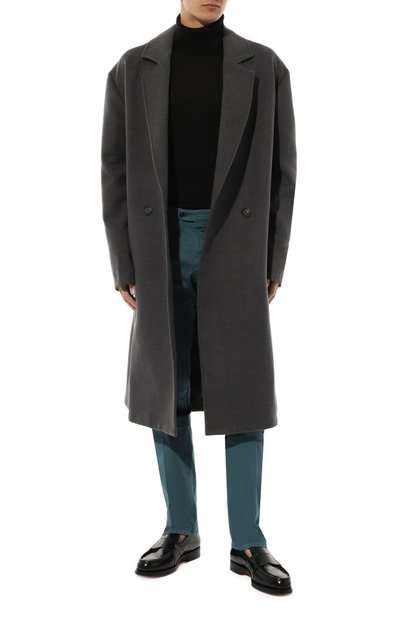 Брюки Tor сшили из эластичной ткани на основе шерсти первого пострига. Модель с поясом-кулиской и отворотами дополнили боковыми, задними прорезными карманами и карго с клапанами.