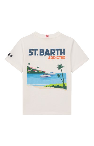Футболку с горловиной в рубчик сшили из хлопкового джерси. Спереди модель украсили контрастным логотипом марки, а сзади дополнили разноцветным брендированным принтом.