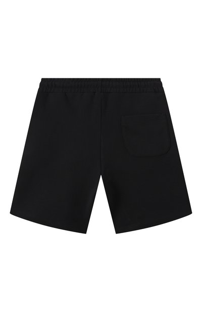 Для пошива шортов с поясом-кулиской и боковыми карманами использовали м ягкий хлопковый футер. Модель украсили контрастным логотипом и фирменным принтом в виде контрастных молний.