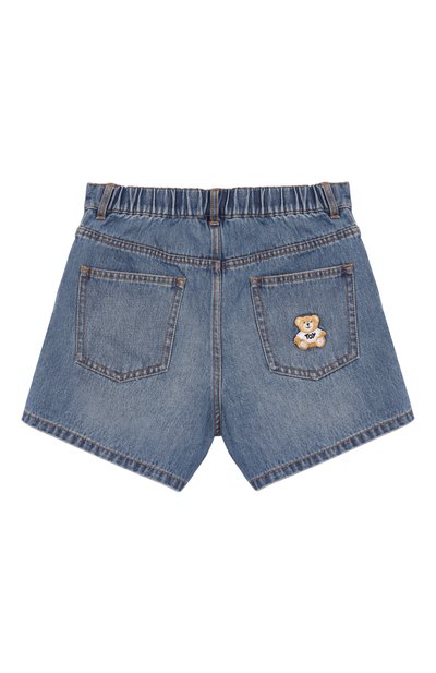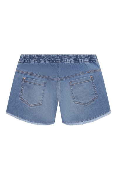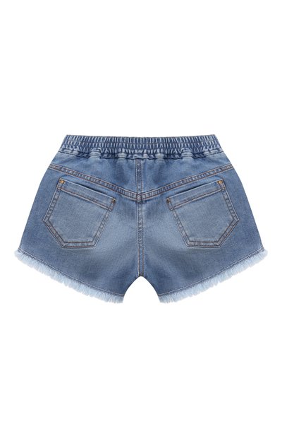 Шорты с пятью карманами сшили из стрейчевого денима. Искусственно состаренную модель с необработанным низом украсили брендированным текстильным патчем спереди и крупным вышитым логотипом сзади.