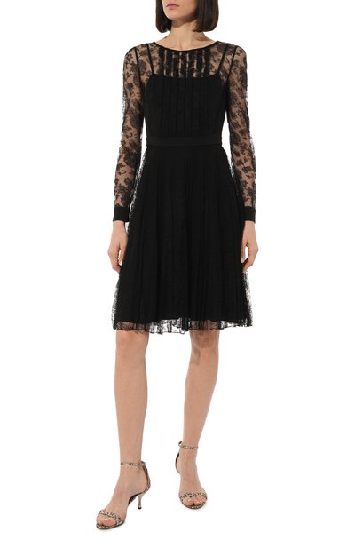 Платье в пол сшили из шелка с принтом Fresco. Модель с подолом, заложенным мелкими складками, застегивается потайной молнией сзади. Талию изделия акцентировали узким поясом с бантом.