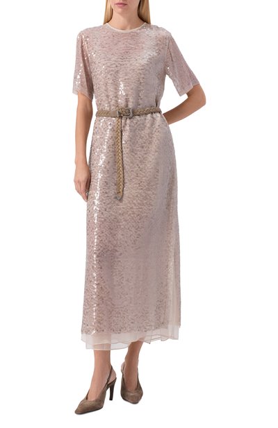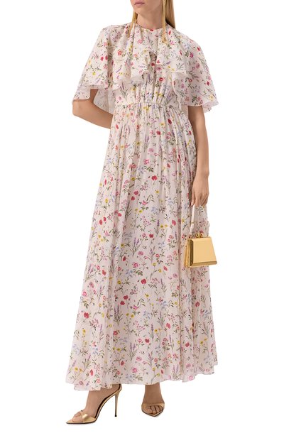 Платье на потайной молнии сзади создали из хлопкового поплина с графичной вышивкой. Модель с рукавами-фонариками дополнили ажурными вставками и широким кружевным кантом вдоль глубокого V-образного декольте.
