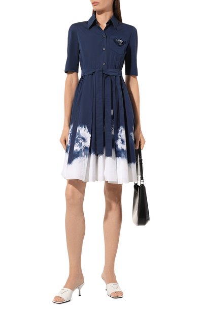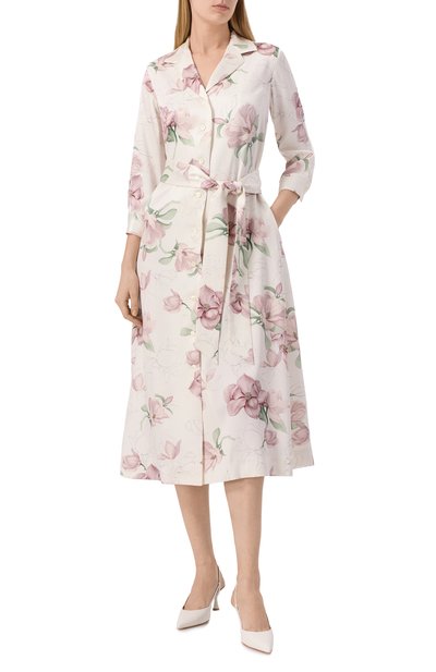 Миди-платье с рукавами-фонариками и шир окими оборками на асимметричном подоле и вдоль V-образного декольте выполнили из тонкого шелка с цветочным принтом. Модель с пуговицами на манжетах дополнили поясом-лентой, фиксирующим запах.