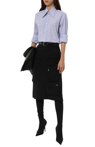 Юбка-карандаш с двумя шлицами сшита из шерсти. Модель с вискозным подкладом дополнена боковыми карманами с клапанами, украшенными золотистыми пуговицами. Изделие застегивается потайной молнией сбоку.
