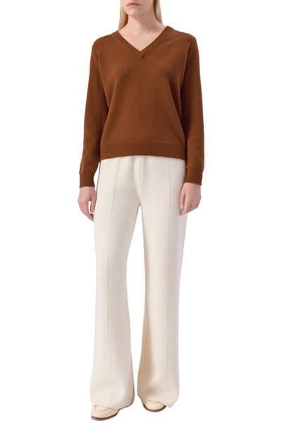 Пуловер с V-образной горловиной, манжетами и поясом в рубчик выполнен из кашемирового трикотажа. Модель со спущенной линией плеч составит гармоничный дуэт с парными брюками.