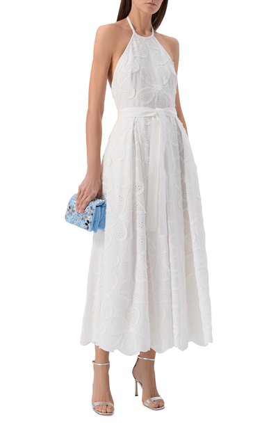Платье с высоким разрезом спереди выполнили из вискозы. Модель с двумя листочками и четырьмя накладными карманами с брендированной фурнитурой застегивается потайной молнией сзад и.