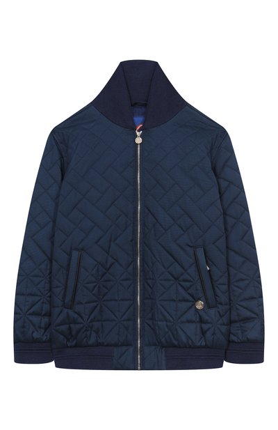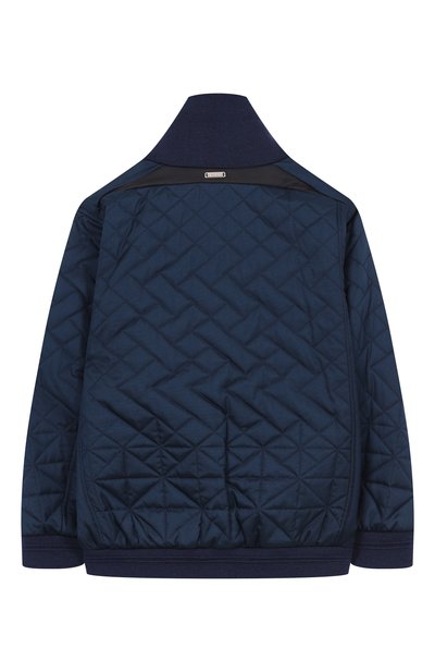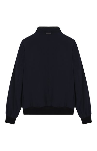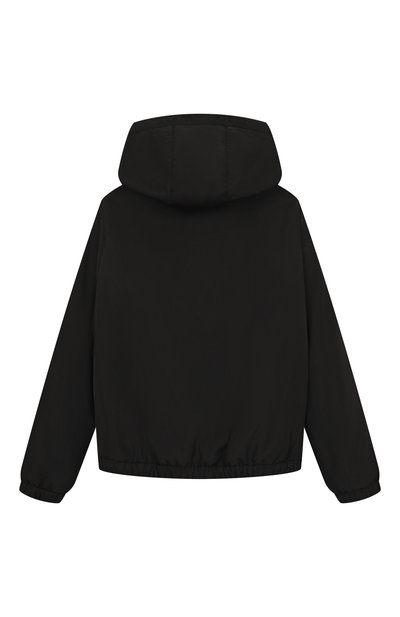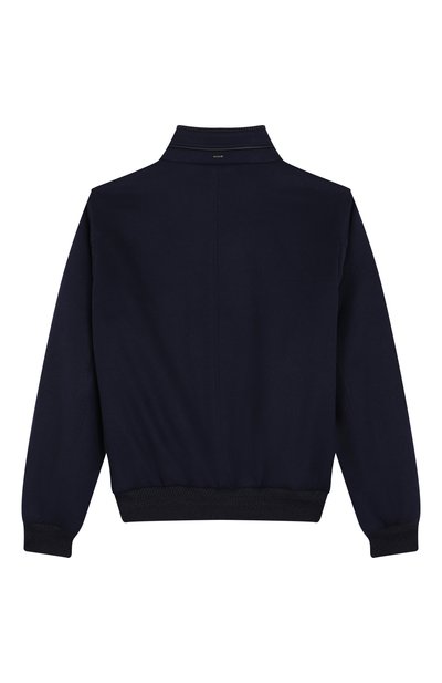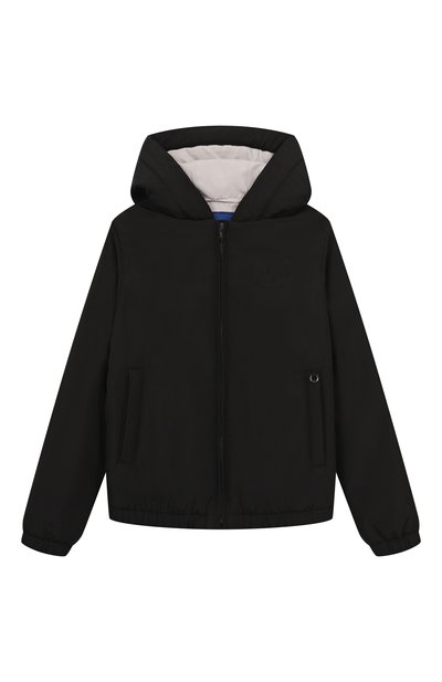 Бомбер со съемным капюшоном, двумя открытыми карманами и одним на молнии выполнен из мягкой смеси кашемира и полиамида. Куртка с манжетами и поясом в рубчик украшена спереди металлической эмблемой марки.