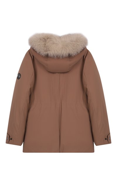 Стеганую пуховую куртку с регулируемыми кулисками на капюшоне и низе выполнили из влагостойкого полиэстера с паттерном из логотипов. Модель с эластичными трикотажными манжетами дополнили боковыми и нарукавным карманами на молниях с брендированными пуллерами.