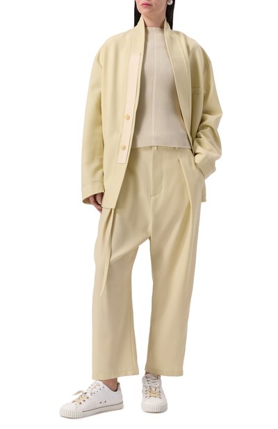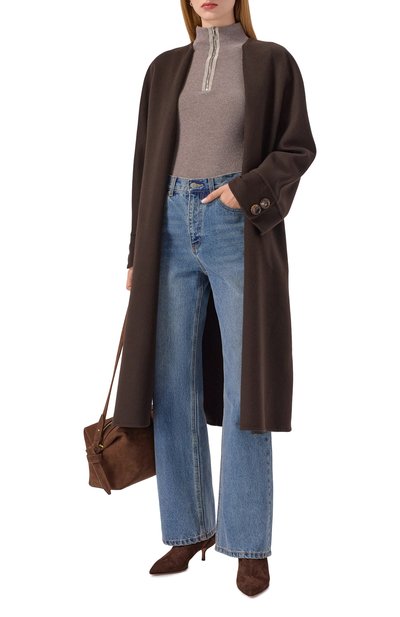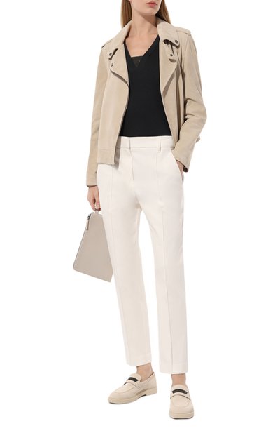 Облегающий пуловер в рубчик выполнили из трикотажа на основе вискозы, усиленного полиэстером. На спинке – фирмен ная вертикальная полоса.