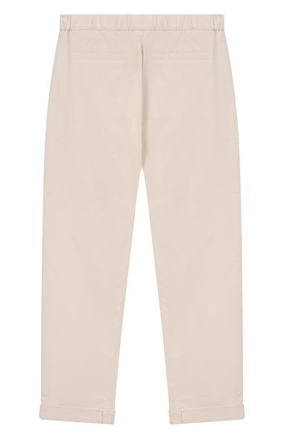 Брюки с небольшими отворотами сшили из габардина стрейч на основе длинноволокнистого хлопка пима. Под эластичным поясом-кулиской заложили парные защипы. Модель, окрашенную в готовом виде, дополнили четырьмя карманами.
