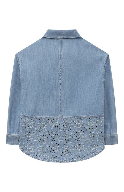 Рубашку из выбеленного хлопкового денима можно носить как легкую куртку. Модель с двумя карманами, отделанными фирменными цепочками мониль, застегивается перламутровыми пуговицами.
