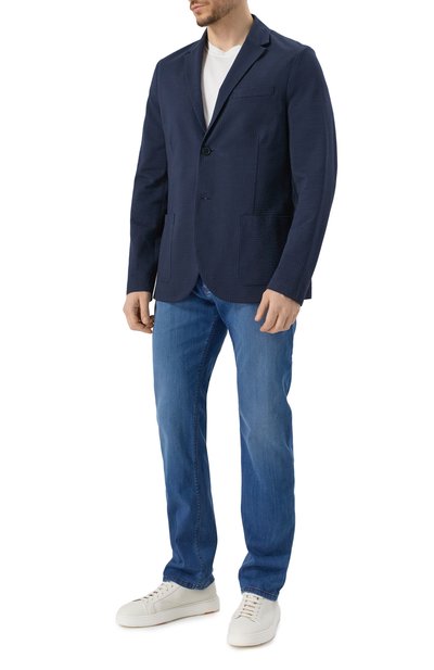 Пиджак с двумя шлицами выполнили из шерсти с жаккардовым микроузором. Однобортную модель дополнили внутренним и тремя внешними карманами, а широкий лацкан украсили фирменной брошью-наперстком.