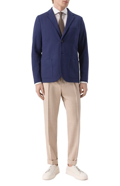 Однобортный пиджак с фирменной брошью-наперстком на лацкане выполнили из хлопкового трикотажа, усиленного нейлоном. Модель с легкой конструкцией без подклада и двумя шлицами сзади дополнили нагрудным карманом, накладными боковыми и внутренним с листочкой.