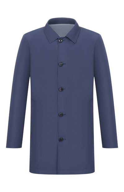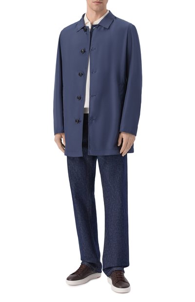 Однобортный плащ со шлицей сзади сшили из стрейчевого габардина на основе хлопка и нейлона. Модель с боковыми карманами и прорезным внутренним с листочкой декорировали фирменной брошью на лацкане.