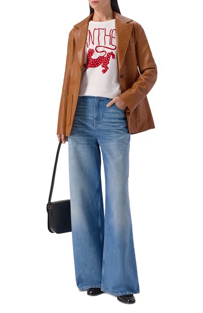 Футболку с графичным монохромным принтом украсили контрастным словно написанным помадой логотипом. Модель с цельнокроеными рукавами сшили из лиоцелла с добавлением хлопка.