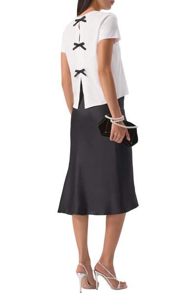 Топ с бантовой складкой и закругленным подолом сшит из ацетата с добавлением шелка. Модель свободного кроя дополнена спереди накладным карманом с вышивкой бисером.