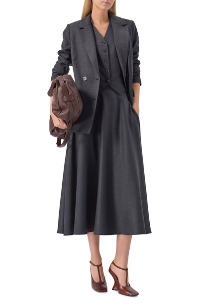 Юбку с узким поясом сшили из атласа с добавлением вискозы. Расклешенная модель с высоким разрезом спереди застегивается потайной молнией сзади.