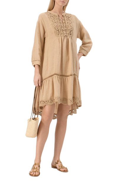 Миди-платье с воротником-стойкой, складками на лифе и широкой кокеткой сшито изо льна. Закругленный подол с вырезами по бокам отделан кружевом. Модель с укороченными рукавами застегивается пуговицами.