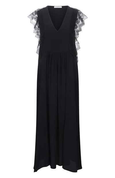 Для пошива длинного платья с карманами в боковых швах расклешенного подола использовали крепдешин с добавлением шелка. Модель с V-образным вырезом украсили на лифе вставками из кружева, сплетенного в технике макраме.