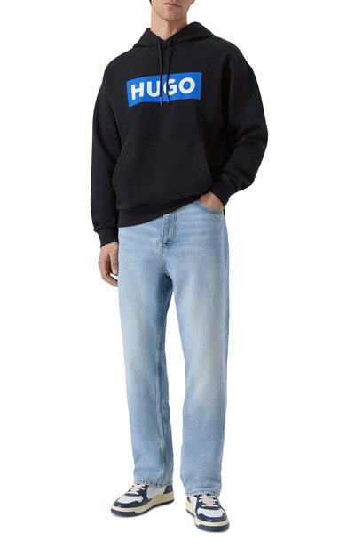 Худи со спущенной линией плеч и нерегулируемым капюшоном выполнили из трикотажа на основе органического хлопка. Модель с манжетами и поясом в рубчик декорировали спереди контрастным прорезиненным логотипом.