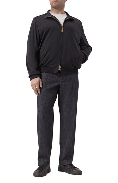 Толстовку из трикотажа на основе хлопка и шелка дополнили узким кожаным кантом спереди, на рукавах и боковых карманах. Сзади под высоким воротником разместили крупный фирменный октагон с логотипом марки. Модель с эластичными манжетами и поясом застегивается встречной молнией с брендированными пуллерами.