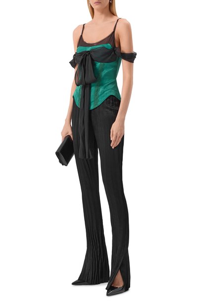 Облегающие расклешенные брюки высокой посадки выполнили из эластичного модала. Наши стилисты предлагают сочетать изделие с контрастным пл атьем и босоножками на каблуке.